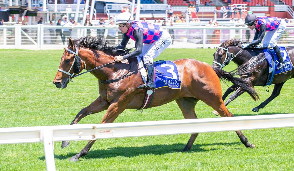 His 2yo colt Beatty looked up to that level after being backed into an odds-on favourite to win the Magic Millions Plate (1100m) on Saturday. Unbeaten colt All On Red (Doubtland) looked home for a hat-trick when he levelled up to front-runner Kute As Kan Be (Acrobat) at the furlong but had no answer when Willie Pike lifted Beatty in the final 50 metres.